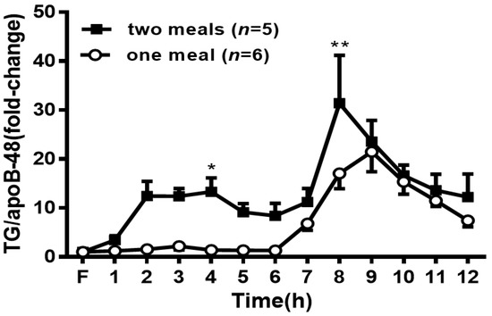 Change in the ratio of lymph TG to apoB48 during the time of treatment. Values are expressed as means ± SEM, n = 5–6 rats per group. * p < 0.05 and ** p < 0.01 compared to the levels in the one-meal group at the same time point.