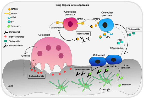 Overview of drug targets and current therapeutics for osteoporosis. Denosumab, Romosozumab, Teriparatide, and Biphosphonates are the most used drugs for OP, highlighted with boxes and in bold. Denosumab inhibits the differentiation of osteoclast precursors to mature osteoclasts and the function of mature osteoclasts. Romosozumab is the most effective treatment for OP, it is an anti-sclerostin antibody that allows increased bone formation rates and reduced osteoclastic activity. Teriparatide is an anabolic agent, homologous to parathyroid hormone, positively regulating osteoblast differentiation and bone formation. Bisphosphonates are the most prescribed therapeutics, they bind to hydroxyapatite of bony surfaces and are absorbed by osteoclasts during resorption, leading to impairment of osteoclast activity and apoptosis.