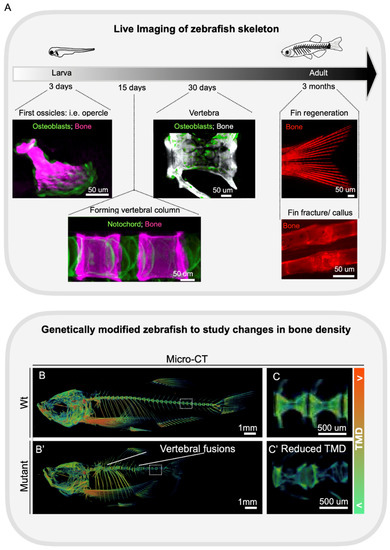 With the transparency gradually lost during development, the adult zebrafish endoskeleton becomes covered by musculature and mineralized scales. While in vivo imaging can still be used to study bony elements located superficially and permanently accessible in fish (i.e., skull, fins, opercula, jaw, and scales) (Figure 3A), to analyze the endoskeleton other technologies, similar to those used in mice, are applied. For example, Alizarin Red staining is used to visualize mineralized bones, and microCT (uCT) allows 3D morphological analysis and precise BMD measurements (Figure 3B,B’,C,C’).