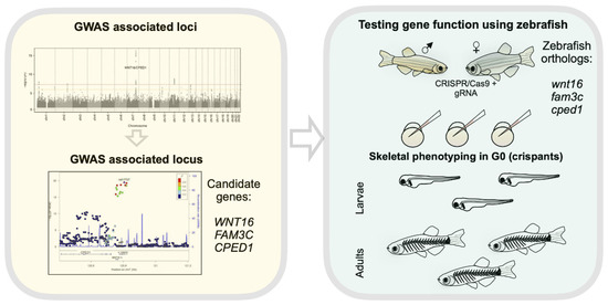 Zebrafish offer rapid functional evaluation of osteoporosis candidate genes identified through GWAS. On the yellow box (left side), we show a Manhattan plot (adapted from Medina-Gomez et al. [191]), followed by the 7q31 locus with genome-wide significant SNPs. Neighbors of WNT16 (CPED1 and FAM3C) are also candidates. As shown on the right side (green box), zebrafish have only one copy of each wnt16, cped1 and fam3c. Zebrafish eggs can be injected with CRISP/Cas9 cocktail targeting each of the zebrafish orthologs. Skeletal phenotyping usually starts three days after injections, in G0s, and can be continued into adulthood.