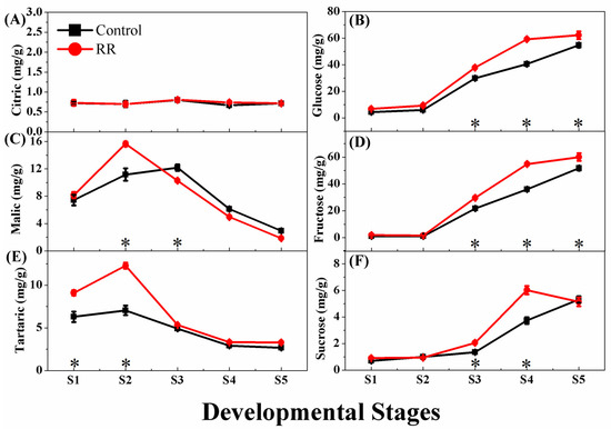Effects of RR treatment on the content change of sugars and organic acids of the grape berry. (A) Citric; (B) glucose; (C) malic; (D) fructose; (E) tartaric; (F) sucrose. * indicates significant differences (p < 0.05, n = 3).