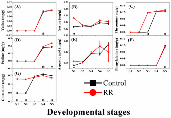 Effects of RR treatment on the content change of amino acids of grape berry. (A) Valine; (B) serine; (C) threonine; (D) proline; (E) aspartic acid; (F) phenylalanine; (G) glutamine. * indicates significant differences (p < 0.05, n = 3).