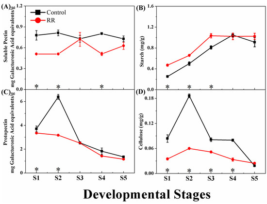 Effects of RR treatment on the content change of starch, pectin, and cellulose of grape berry. (A) Soluble pectin; (B) starch; (C) protopectin; (D) cellulose. * indicates significant differences (p < 0.05, n = 3).