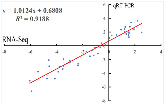 Fifty transcripts involved in the primary metabolic pathways were randomly selected for qRT-PCR detection. These randomly selected genes (VIT_01s0010g02460, VIT_06s0004g02620, VIT_07s0005g00750, VIT_13s0019g04460, and VIT_13s0074g00390) were upregulated, downregulated, and unaffected by RR treatment compared to control. Linear regression analysis showed an overall determination coefficient of 0.9188 (Figure 4), indicating that the qRT-PCR expression profiles were in agreement with the RNA-Seq values. The determination coefficient result suggested the reliability of the RNA-Seq data.