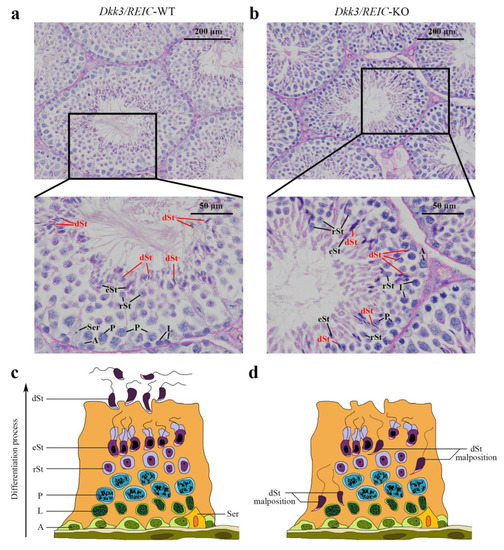 PAS staining of the testicular sections. (a) In the Dkk3/REIC-WT testicular section (stage VIII–IX of spermatogenesis), the distribution of germ cells was well arranged, and the tadpole-like differentiated sperm were uniformly located around the seminiferous tubule lumen waiting to be released. (b) In the Dkk3/REIC-KO testicular section (stage VIII–IX of spermatogenesis), however, the germ cell distribution was much disordered, few mature spermatids were in or surrounding the central lumen, while the differentiated sperm (marked by in red) irregularly wandered adjacent to the basement membrane. (c) The schematic drawing of typical spermatogenesis in the Dkk3/REIC-WT seminiferous epithelium. (d) The schematic drawing of pathological spermatogenesis in the Dkk3/REIC-KO seminiferous epithelium. Abbreviation: A = spermatogonia, Ser = sertoli cell, L = spermatocytes in leptotene phase, P = spermatocytes in pachytene phase, rSt = round spermatids, eSt = elongated spermatids and dSt = differentiated spermatids.