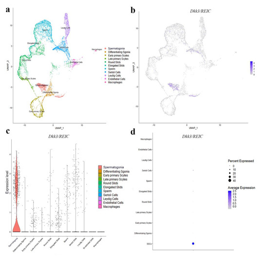 Cells with less than 500 expressing genes or more than 20% mitochondrial genome were discarded. After normalization and scaling, principal components (PCs) were calculated using the RunPCA function, and dimensionality reduction was achieved with the RunUMAP function. Finally, using the FindCluster function (resolution = 0.6), 11 clusters were found and further identified as different testicular cell types according to their expressed cell marker genes. The expression of Dkk3/REIC was demonstrated by FeaturePlot, VlnPlot and DotPlot functions.