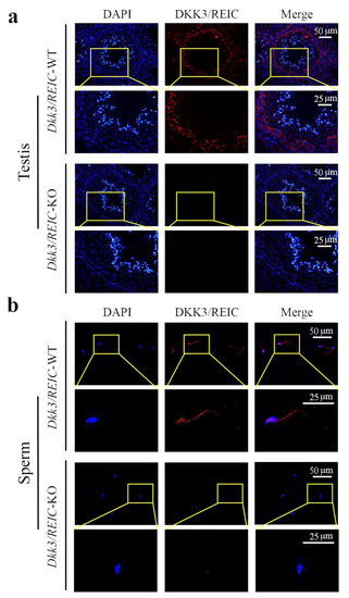 For the immunofluorescence staining of sperm, the epididymal sperm were extracted and made into sperm smears, which were subsequently formalin-fixed for 40 min at room temperature. Antigen blocking was performed using goat serum for 60 min. The smears were then incubated in anti-DKK3/REIC primary antibody overnight at 4 °C. Normal goat IgG was applied as a negative control (Figure S2). The use of secondary antibody and observation procedures were the same as with the testicular slides.