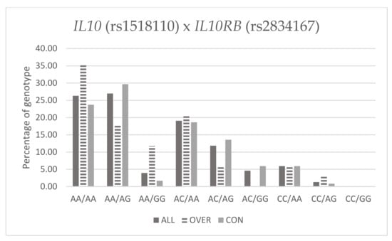 The prevalence of A/G × A/A is almost three times less than A/A × A/A (IL10RB × IL10) and two times less for the A/G × A/C than for A/A × A/C (IL10RB × IL10) in OVER FAT group in codominant model. In the same group alleles arrangement, A/G × A/A was almost three times less than for A/A × A/A (IL10RB × IL10) and one and a half times less for the A/G × A/C − C/C than for the A/A × A/C − C/C (IL10RB × IL10) in dominant model.