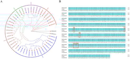 Multiple sequence alignments of all cellulose synthase protein sequences in G. hirsutum and Arabidopsis thaliana were performed using Muscle Wrapper in TBtools software (version 1.098691) with the default settings [31]. Then, using trimAL Wrapper in TBtools software, the multiple sequence alignment results were clipped. Finally, the maximum likelihood (ML) method was employed to construct phylogenetic trees using the same software. The number of bootstraps was 1000. The phylogenetic tree was constructed on the Newick file generated by MEGA through the online website EvolView [36].