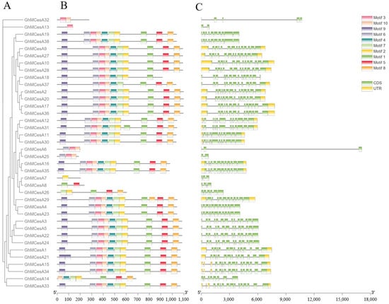 Phylogenetic tree, motif, and gene structure of GhMCesA genes in G. hirsutum. (A) Phylogenetic analysis of the amino acid sequence of CesA in G. hirsutum. (B) Conserved motifs of CesA proteins in G. hirsutum. (C) The gene structures of the CesA genes. The yellow rectangle represents CDS. The green rectangle represents UTR.