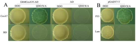 By predicting the results, we constructed an interaction network and used GhCesA7 as the candidate gene (Supplementary Materials Figure S1). Moreover, our results showed that the experimental group (GhMCesA35-AD + CesA7-AD) and the positive control (pGBKT7-p53 + pGADT7-T) grew well on SD-Trp-Leu (DDO) and SD-Trp-Leu-His-Ade/X-α-Gal/ABA (QDO/X/ABA) medium (Figure 6A). However, the negative controls grew on the DDO medium but could not grow on the QDO/X medium (Figure 6B). The above results showed that GhMCesA35 interacted with GhCesA7.