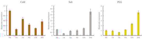 To examine the expression of GhMCesA35 under different stress treatments, we set up 3 stress treatments, and samples were taken within 0, 1, 3, 6, 12, and 24 h. After cold stress treatment, we found that the expression level of GhMCesA35 was lower than the control treatment (Figure 7). However, under the drought and salt stress treatment, the expression level of GhMCesA35 was higher than that of the control treatment (Figure 7).