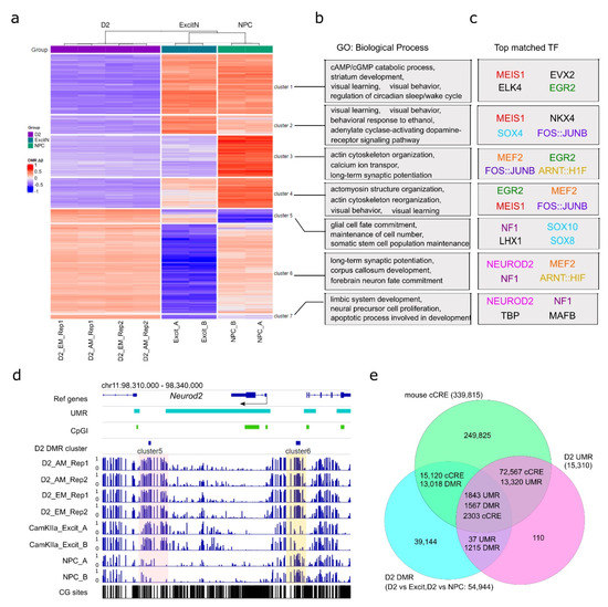 NAc D2-MSN-specific CpG DMRs. (a) K-means clustering of 51,704 NAc D2-MSN-specific autosomal CpG DMRs, in comparison to NPCs and PFC CamKIIa+ excitatory neurons. Two sets of DMRs are combined. For each DMR, the delta β values of individual samples (compared to the average methylation level across all samples) are used for clustering. (b) Representative biological process gene ontology (GO) terms enriched with genes associated with each cluster of CpG DMRs in panel a. (c) Transcription factors (TFs) with matched sequences of the top 4 motifs enriched in each of the seven CpG DMR clusters. Identical or similar transcription factors are in the same color, except where black is used for motifs only recognized in a single cluster. (d) The genomic locus of Neurod2 is a representative of transcription factor genes enriched in D2-MSN hyper CpG DMRs with D2-MSN-specific hypermethylation. The shaded regions indicate notable cell type-specific differential methylation when compared to NPCs or PFC excitatory neurons. (e) UMRs and cell type-specific DMRs are largely overlapped with mouse cCREs. D2: D2-MSNs. CamKIIa_Excit: PFC CamKIIa+ excitatory neurons. NPC: neural progenitor cells. AM: AM-seq. EM: EM-seq.