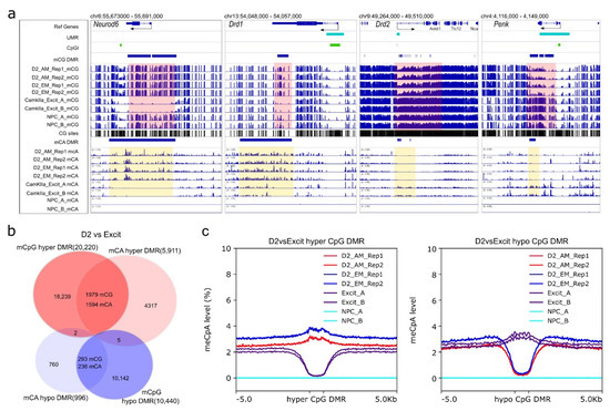 To further explore D2-MSN regulatory regions beyond UMRs, we performed differential CpG methylation analysis by comparing our data to the methylomes of postnatal day 3–4 mouse NPCs [57], and CamKIIa+ excitatory neurons from PFC of 8–14 weeks old adult male mice [22]. Both datasets were generated using the MethylC-seq protocol [75] with around seven-fold coverage of each strand. Compared to accumbal D2-MSNs, the global CpG methylation level was about 2% lower in NPCs (~78.5%) and slightly higher (less than 1%) in excitatory neurons (81.2% and 81.4% for two replicates). Furthermore, we identified 24,284 CpG DMRs between D2-MSN and NPC methylomes, with the majority of them (21,854) being hypomethylated in D2-MSNs (Figure 4a, Table S8), supporting the concept of accumulation of global methylation during cell differentiation with widespread depletion of methylation at regulatory regions [57,76,77]. When compared to PFC excitatory neurons, we identified 30,660 CpG DMRs with 10,440 hypomethylatedDMRs and 20,220 hypermethylatedDMRs (Figure 4a, Table S9) in D2-MSNs. Most of these CpG DMRs were located within distal introns and intergenic regions (Figure S5a).