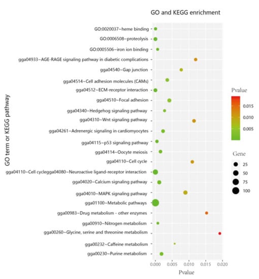 In total, 1317 DEGs (Table S1) were identified between the breast meat samples from Line B and Jingxing Yellow chickens. The GO and KEGG enrichments of these genes are summarized in Figure 1. The enriched genes were mainly associated with fatty acid metabolism (extracellular matrix (ECM) receptor interaction pathway; focal adhesion; Wnt signaling pathway), amino acid metabolism (proteolysis; glycine, serine, and threonine metabolism; alanine, aspartate, and glutamate metabolism), and binding to heme and iron (heme binding; iron ion binding).