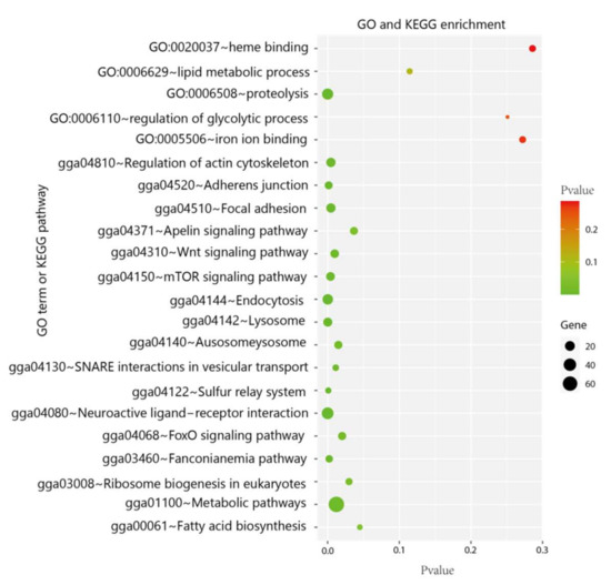 GO- and KEGG-enriched items associated with fatty acid metabolism, protein turnover, and binding to heme and iron. The spot size represents the enriched gene number, and the spot color represents the p-value.
