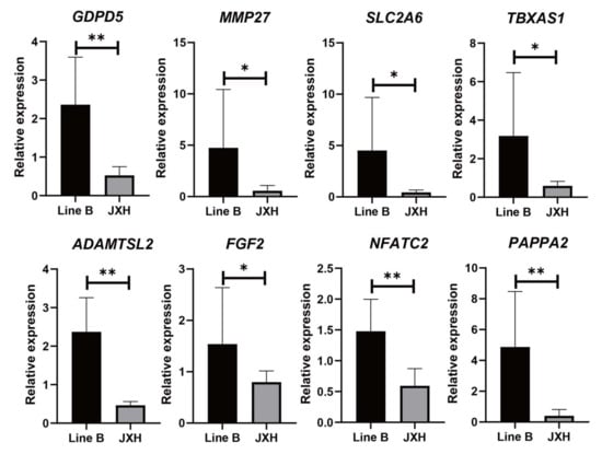 Verification of candidate gene expressions by RT-qPCR in Line B and Jingxing Yellow chickens (JXH), * p < 0.05, ** p < 0.01.
