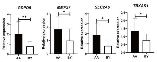 Verification of candidate gene expressions by RT-qPCR in Arbor Acres (AA) and Beijing-you chickens (BY), * p < 0.05, ** p < 0.01.