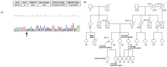 In addition, one patient (1.8%) showed DM in BRCA2. The family with DM does not show a more severe phenotype than families with a single mutation. The BRCA2 DM c.631G>A (p.Val211Ile)/c.7008-2A>T (IVS13-2A>T), was described in unrelated HBOC families [37] and was previously reported in a patient with PDAC [38]. Moreover, it was previously reported in male breast cancer patients [39,40], suggesting high penetrance in PDAC and MBC development in carriers of DM c.631G>A (p.Val211Ile)/c.7008-2A>T (IVS13-2A>T).Remarkably, in the present study, we describe a novel germline mutation in BRCA2 gene, c.5511delT (p.Phe1837LeufsX3), previously observed in tissue of mucoepidermoid carcinoma [23]. We identified this mutation in a woman affected with breast cancer; her mother was affected with PDAC and died at 78 years old. The mutation is very likely inherited from the maternal side, in which occurs HBOC related tumors (Figure 2B).