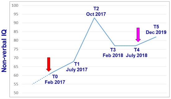 Variation in global non-verbal I.Q. over time, as recorded using the Leiter-R scale [35]. The beginning and the end of lithium treatment are indicated by the red and purple arrows, respectively. The hyphenated line connects T0 with a prior I.Q. measurement performed elsewhere at age 11 using the WISC-III scale (see text).