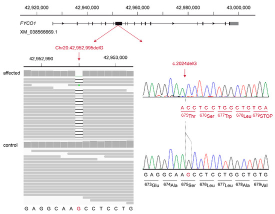 The second candidate variant was a 1 bp frameshift deletion in the FYCO1 gene encoding the FYVE and coiled-coil domain autophagy adaptor 1. It can be designated as XM_038566669.1:c.2024delG or Chr20:42,952,995del (UU_Cfam_GSD_1.0) (Figure 2). This frameshift deletion introduces a premature stop codon and is predicted to truncate ~50% of the open reading frame, XP_038422597.1:p.(Ser675Thrfs*5).