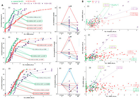 Dependence of f-SatIII content on NOX4, 8-oxodG, γH2AX, BAX levels in the lymphocytes of SZ and HC groups. (A1,A3,A5). Cumulative distributions of FL1-NOX4, FL1-8-oxodG, and FL1-γH2AX in the lymphocytes of SZ, HC, and St groups. See descriptive statistics for the groups in Table 4. The significance of the observed differences was tested using a non-parametric Mann–Whitney U test (p) and Kolmogorov–Smirnov (D and α) statistics (Table 3). (A2,A4,A6). Changes in FL1-NOX4, FL1-8-oxodG, and FL1-γH2AX during the educational process in St subgroups. All the data were normalized by the parameter values in the St(I) subgroup. Red horizontal lines indicate the relative standard error of the experiment. Changes in FL1-NOX4, FL1-8-oxodG, and FL1-γH2AX exceeded the standard error. (B1–B3). The link between FL1-NOX4, FL1-8-oxodG, and FL1-γH2AX in the samples studied. The graphs show the data for linear regression (k) and Spearman’s correlation coefficient ®.