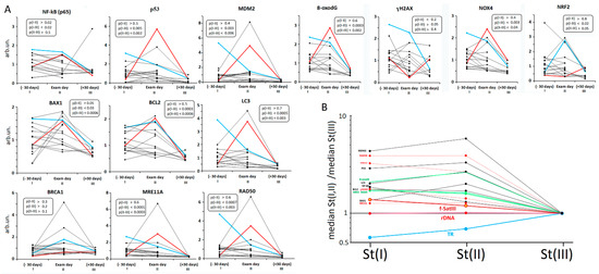 Changes in the contents of some markers in the students’ lymphocytes during the educational process. (A) Changes in the contents of some markers in the students’ lymphocytes during the educational process. Straight lines connect the dots for each student. The inscription on the graphs compares the three subgroups by the analyzed index (Mann–Whitney U test). (B) Comparison of three St subgroups by medians of the contents of the three repeats in the genome and medians of the contents of some markers in the students’ lymphocytes. All the data were normalized by the parameter values in St(III) subgroup (the period of the least stress).