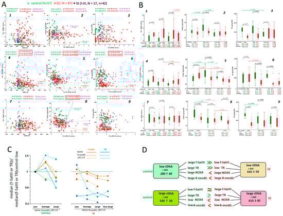 The link between the contents of rDNA, f-SatIII, TR in the genomic DNA and the contents of stress markers NOX4, 8-oxodG, and γH2AX in the lymphocytes. (A1,A4,A7). Dependence of FL1-NOX4, FL1-8-oxodG, and FL1-γH2AX on rDNA CNs for the samples studied. (A2,A5,A8). Dependence of f-SatIII on FL1-NOX4, FL1-8-oxodG, and FL1-γH2AX for the samples studied. (A3,A6,A9). Dependence of TR count on FL1-NOX4, FL1-8-oxodG, and FL1-γH2AX for the samples studied. The graphs show the data for linear regression (k) and the Spearman correlation (R) coefficients. (B1,B4,B7). Analysis of NOX4, 8-oxodG, and γH2AX in HC and SZ subgroups that differed by rDNA CNs. (B2,B5,B8). Analysis of f-SatIII content in HC and SZ subgroups that differed by FL1-NOX4, FL1-8-oxodG, and FL1-γH2AX levels. (B3,B6,B9). Analysis of TR content in HC and SZ subgroups that differed by FL1-NOX4, FL1-8-oxodG, and FL1-γH2AX. The Tables in the figures present the descriptive statistics. The graph shows sample comparisons using non-parametric Mann–Whitney U statistics. (C). Scheme that displays the change in the contents of f-SatIII and TR in DNA depending on the contents of NOX4, 8-oxodG, and γH2AX markers in the lymphocytes of the test groups. (D). Scheme showing the contents of f-SatIII and TR in DNA and the contents of the stress markers NOX4 and 8-oxodG in the lymphocytes, depending on rDNA contents in HC and SZ groups.