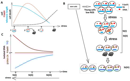 Stress leads to heterogeneity between cells by the contents of f-SatIII and TR (Figure 6B). An assay of DNA isolated from the experimental cells showed an increase in the f-SatIII content and a decrease in the TR content, as compared to the “ideal” population (Figure 6C). The stress-induced death of cells contains a high content of f-SatIII and a low content of TR. With the normal elimination of defective cells from the bloodstream and a reduction in stress, a low level of f-SatIII and a high level of TR will be detected in the total DNA samples of these cells. This correlates with a decrease in the level of cells with damaged DNA (Figure 4B).