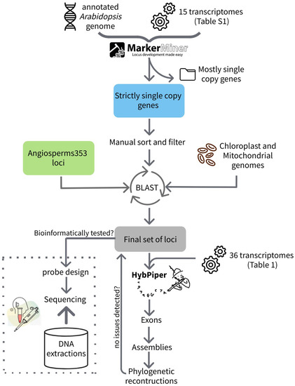 For the purpose of this study, we used MarkerMiner 1.0 (MM) [29], as implemented in the University of Florida High-Performance Cluster (Hipergator) (Figure 1). We used 15 transcriptomes representing all the main clades in Cactaceae (Table S1). In addition, we selected the Arabidopsis thaliana reference genome (TAIR10, [30]) as the closest relative to Cactaceae among the datasets implemented in MarkerMiner. We then inspected the results from MarkerMiner and focused exclusively on the strictly single-copy loci. We manually trimmed our locus sequences in Geneious Prime 2020.0.5 (https://www.geneious.com accessed on 1 August 2020) to include only single-copy loci that contained at least one suitable exon of >120 bp size and intronic regions of 100 bp or more. To avoid the inclusion of any non-nuclear loci, we performed several BLASTx analyses among all the target sequences and (1) Beta vulgaris and A. thaliana mitochondrial genomes, and (2) A. thaliana and Cylindropuntia bigelovii chloroplast genomes [11,31]. In addition, we performed a BLASTx analysis with the A. thaliana whole nuclear genome (Araport11, [32]) to confirm and update the MM annotation results. At the same time, we explored each single-copy locus potential annotations from the GenBank and TAIR database. Finally, we reduced to one copy any identical loci after a reciprocal BLAST between the MarkerMiner, Angiosperms353, and within each probe set.