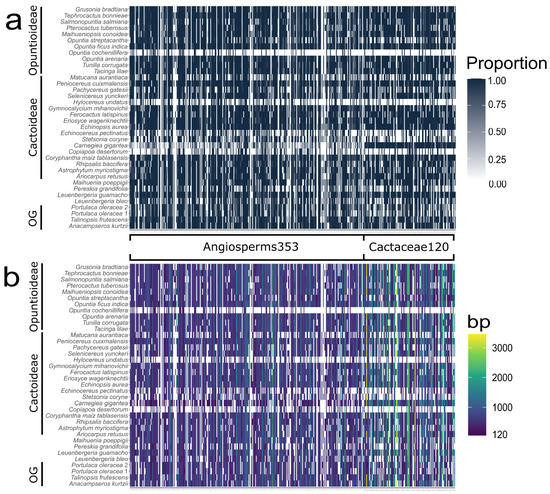 Heatmap plot showing recovery efficiency. Columns represent the targeted loci grouped based on probe sets and rows represent the 36 transcriptomes grouped based on the main groups in Cactaceae (OG: outgroup). (a) Length proportion of the target sequences recovered. (b) Size of the target gene sequences recovered.
