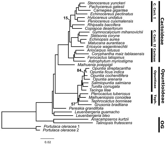 RAxML best-scoring ML tree of the concatenated database of the two probe sets. All nodes have ≥95% support value bootstrap unless noted. OG: Outgroups; Teph.: Tephrocacteae; C. Cact.: Core Cactoideae.