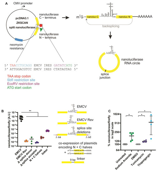 Following co-transfection of the ZKSCAN EMCV split NanoLuc and the pGL4.13 plasmid encoding a firefly luciferase protein, both NanoLuc and firefly luciferase activities were measured and the NanoLuc over firefly ratio was plotted (Figure 1B). To show that the insertion of an IRES is required for translation, the EMCV IRES was inserted in the reverse orientation, which completely abolished NanoLuc production (Figure 1B). We further tested if backsplicing was required for NanoLuc expression by removing either the two conserved nucleotides in the intron of the splice donor or the splice acceptor site by site-directed mutagenesis. Loss of splicing was confirmed by Northern blotting (Figure S2). Removal of those conserved nucleotides indeed abolished NanoLuc expression, suggesting that backsplicing is a required step. Co-expression of the N- and C-terminal NanoLuc fragments from two co-transfected mammalian expression plasmids encoding either fragment also displayed minimal expression. Although insertion of a short, 9-nt unstructured linker increased NanoLuc expression about 15-fold to 0.047 ± 0.012 A.U, these values were 1600-fold lower than the NanoLuc expression values from the EMCV IRES. (Figure 1B). Since IRES-mediated translation increases in the presence of stressors, we next exposed cells transfected with the ZKSCAN EMCV split NanoLuc reporter for 5 h to 100 μM sodium arsenite, 20 μM tunicamycin and 20 μM thapsigargin. All these reagents activate the integrated stress response, which causes phosphorylation of the translation initiation factor eIF2α at serine 51 [32,33]. Phosphorylation of eIF2α is known to increase IRES-mediated translation. We expected that stress induction would result in increased NanoLuc and lower firefly luciferase expression, as firefly luciferase cap-dependent translation would be inhibited. Following normalization to the untreated or DMSO controls, all stress-inducing chemicals displayed an increase in the ratio compared to the control. The DMSO treatment control was used for the normalization of tunicamycin and thapsigargin-treated samples, as those two compounds are dissolved in DMSO. Tunicamycin had a moderate effect compared to both sodium arsenite and thapsigargin (Figure 1C).