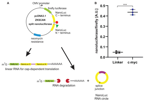 For the split NanoLuc reporter, we sought to split the NanoLuc ORF in a position where both NanoLuc fragments, when co-expressed, would not be able to yield active NanoLuc protein. Zhao et al. showed that a NanoLuc protein split between amino acid positions 117 and 118 is unable to complement and yield active NanoLuc [31]. Hence, we designed a gene block where the EMCV IRES was flanked by the C-terminal NanoLuc fragment upstream and the N-terminal NanoLuc fragment downstream. The complementary sequences from the ZKSCAN plasmid were located upstream and downstream of the NanoLuc fragments to allow for insertion of the resulting gene block into the PCR-amplified pcDNA3.1(+) ZKSCAN1 MCS-WT Split GFP plasmid via Gibson assembly cloning. These sequences also facilitate the backsplicing event that forms the RNA circle. Upon transfection of the plasmid, the CMV promoter promotes transcription to generate a linear RNA, which is capped and polyadenylated on the 5′ and 3′ ends, respectively. Upon backsplicing, the split ORF from the NanoLuc gene is fused, resulting in a circular RNA containing the EMCV IRES, followed by the entire NanoLuc ORF and an in-frame stop codon (Figure 1A).