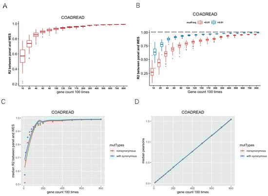 Establishment of screening criteria for TMB gene panel collection. (A) Coefficient of determination (R2) between random gene panel TMB from mutated gene and WES TMB. With the increase in random gene in gene panel, R2 had a tendency of becoming flat. (B) R2 between random gene panel TMB from high-mutation group (mutation frequency > 0.01) and WES TMB (blue boxplot), low-mutation group (mutation frequency < 0.01), and WES TMB (red boxplot). R2 values were significantly different (‘****’ means Wilcox test p value < 0.0001) between these two groups. (C) Median R2 between synonymous mutations included and excluded for gene panel TMB and WES TMB. (D) Median gene length of synonymous mutations included and excluded from random gene panel.