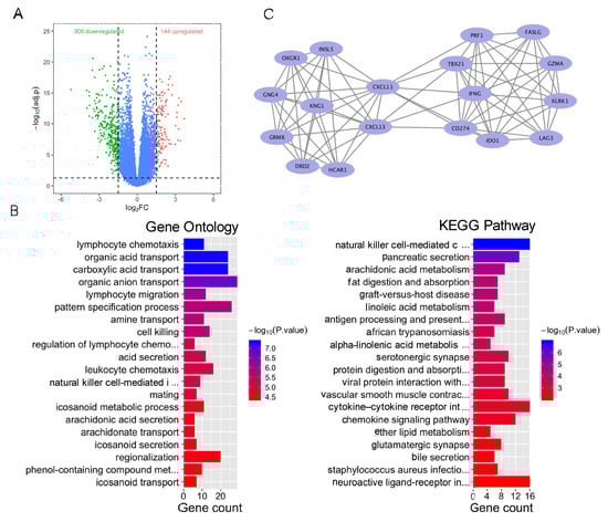 Bioinformatics analysis of differentially expressed genes of the high- and low-TMB group. (A) Volcano plot of differentially expressed genes among the high- and low-TMB group. (B) GO and KEGG enrichment of differentially expressed genes in the high- and low-TMB group. Blue color indicates lower p value. Red color indicates higher p value. (C) Main gene clusters.