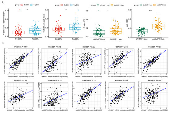Differentially expressed genes of the high- and low-TMB group related to CD8+ T cell infiltration. (A) CD8+ T cell infiltration score of the high- and low-TMB group (left two plots). CD8+ T cell infiltration score of JAKMIP1 high- and low-TMB group (right two plots). ‘**’ means Wilcox test p value < 0.01. ‘***’ means Wilcox test p value < 0.001. ‘****’ means Wilcox test p value < 0.0001. (B) Pearson correlation of JAKMIP1 expression with CD8A, IFNG, TNF, CCL4, CCL5, BATF3, XCR1, CXCL9, CXCL10, and CXCR3. Any sample with JAKMIP1, CD8A, IFNG, TNF, CCL4, CCL5, BATF3, XCR1, CXCL9, CXCL10, and CXCR3 expression of 0 was removed.