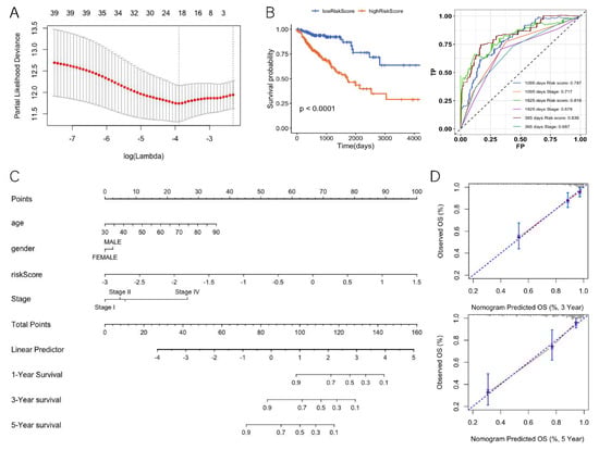 Differentially expressed genes of the TMB high and low groups related to prognosis. (A) LASSO cox regression feature-selection results. (B) Risk score prognostic curve (left) and risk score ROC curve (right). (C) Nomogram for predicting the 3- and 5-year OS. (D) Calibration plot for nomogram-predicted and observed 3- and 5- year survival rates.