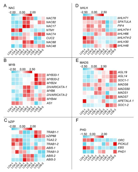 We first conducted expression profiling of all transcription factors. A total of 1192 transcription factors (TFs) were identified and then classified into 25 families (Figure 6A). Here, we put the TF families with relatively few members under the category of ‘others’ (Figure 6A). In addition, a heatmap representation of TF expression profiles and hierarchical clustering analysis is shown in Figure 6B. The heatmap shows that 1192 TFs were expressed differentially among the Lo 4 cm, Lo 6 cm and Lo 8 cm stages (Figure 6B).