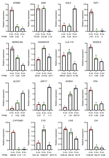 To further verify the transcriptomic analysis, 16 DEGs were selected for qRT-PCR validation. These genes included transcription factors related to anther development and callose degradation, genes related to microspore maturation and genes related to plant hormone signaling. The results showed that the expression patterns of these DEGs were similar to the changes in FPKM values in the transcriptome data (Figure 9), thus supporting that our transcriptomic data and analyses are of high quality.