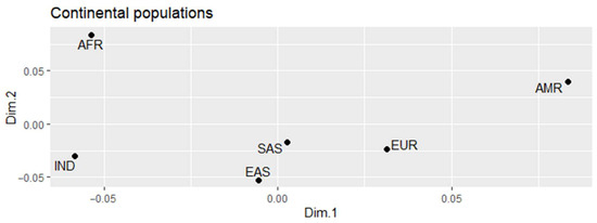 The distancing of the IND and AMR groups was not expected (FST value = 0.07114); however, this analysis was only evaluated in the variants found for the investigated genes. The sample of the American population of the 1000 Genomes Project includes several countries in Latin America, such as Mexico, Peru, Colombia, and Puerto Rico, countries with Amerindian ancestral contributions that are heterogeneous among them, due to the different historical aspects of their formations and their degree of genetic mixing, which can explain the distance we found [11,28,29,30].
