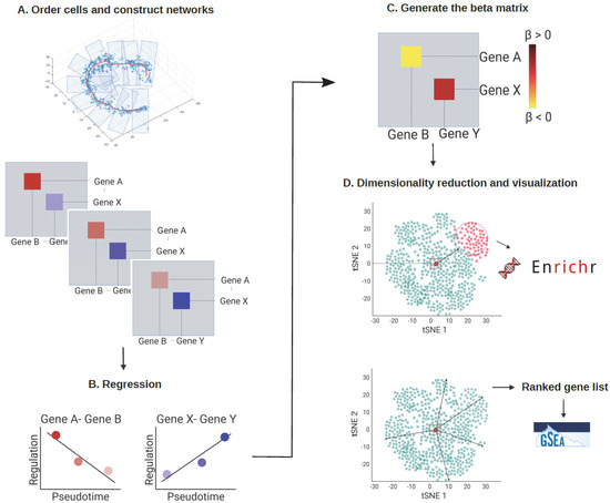 The analytical framework of scInTime. (A) Step 1: Order cells and construct networks. The cells are arranged and divided into 10 subgroups according to the pseudotime inferred using a pseudotime analysis tool, such as Monocle 3. Each group stands for a different transition state. Next, an scGRN is constructed for each group of cells. Each scGRN depicts gene-gene regulatory relationships at the given pseudotime point. A total of 10 scGRNs are constructed, each comprising the progressive transcriptomic profile of the given cellular process. (B) Step 2: Fit a linear regression model to the 10 scGRNs. We fit a linear regression model for the 10 coefficients on the state index for each pair of genes. If this pair of genes’ regulation strength increases along the 10 stages, the regression coefficient will be positive and vice versa. (C) Step 3: Generate the regression coefficient matrix. All the regression coefficients are collected into a single regression coefficients matrix, representing the global profile of all pairs of gene-gene regulation changes across the given cellular process. (D) Dimensionality reduction and visualization of the regression coefficients matrix. We used tSNE embedding to reduce dimensionality on the regression coefficients matrix and visualize it. Each dot in the tSNE plot represents a gene embedded in the 2D plot based on its global profile in the regression coefficients matrix. The k-means clustering algorithm divides the genes in the regression coefficients matrix into 50 clusters. Enrichr analysis is performed on selected gene clusters. The genes are rank ordered according to their Mahalanobis distance to the embedding center. Then, the GSEA analysis is performed on the ranked gene list.