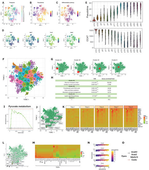 scInTime analysis with time-resolved scRNA-seq data from mouse CMs reveals gene expression programs in CM maturation. (A) Visualization of cells using tSNE embeddings plot. The cells are collected at 15 time points and color-coded accordingly. (B) tSNE visualization of cells colored according to their pseudotime estimation. The pseudotime is estimated using Monocle 3. (C) tSNE visualization of cells colored according to their differentiation potency. The differentiation potency is estimated using CCAT. (D) Expression level (log-transformed UMIs) of four representative genes, expressed differentially at different time points. (E) Boxplot of cells in different developmental stages (time points), colored by their pseudotime (up) and differentiation potency (bottom). (F) Clustering of genes in the tSNE plot. In the plot, each dot represents a gene. The 6969 genes are clustered into 50 clusters using the k-means algorithm. Genes in the same cluster have a similar profile in the regression coefficient matrix. (G) Positions of four clusters: #44, #40, #6, and #25, in the tSNE plot. Clusters #44 and #40 are located in the peripheral region of the 2D tSNE plot; clusters #6 and #25 are located in the central region. (H) Results of enrichment analysis for the four clusters in (F). N.S., not significant; N.A., not applicable. (I) GSEA enrichment plot for Pyruvate metabolism. (J) tSNE visualization of genes (n = 6969) embedded in a 2D plot based on each gene’s profile in the regression coefficient matrix. The leading-edge genes for pyruvate metabolism given in GSEA analysis are highlighted in red. (K) A pseudotime-series heatmap showing the change of regulatory strength between genes as a function of time. The genes shown are the leading-edge genes in Pyruvate metabolism, as in (I,J). (L) Positions of the 30 genes with the highest regulatory strength with Ppara in the tSNE plot. The genes labeled with black stars are from the model showed in (O), as in (M). (M) Heatmap of regression coefficient values (levels of regulatory strength) between Ppara and each of its top 30 regulated genes across 10 pseudotime intervals. The genes labeled with black stars are from the model showed in (O), as in (L). (N) The expression level of three selected genes (Acaa2, Acadvl, and Ndufa10) as a function of pseudotime. (O) The model of the regulations among the selected genes. Ppara, as an important regulator of fatty acid metabolism, activates fatty acid metabolism genes, including Acadvl and Acaa2, and genes related to mitochondrial energy metabolism (Ndufa). Ppara agonists can inhibit Cox genes expression.