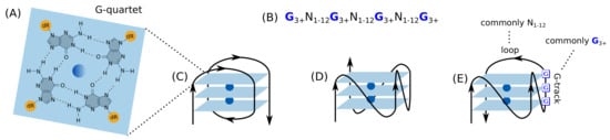 The structure and topologies of G4. (A) Structure of a G-quartet formed by hydrogen bonded four guanines and central cation (blue). (B) The consensus sequence of G4. Representative topologies of unimolecular G4s based on the strand direction: (C) antiparallel, (D) parallel, and (E) hybrid.