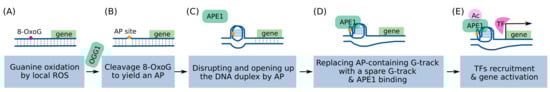 The suggested model encompasses sequential molecular events (Figure 2) [,]: local ROS generate 8-OxoGs from a promoter PQS; OGG1 cleaves the 8-OxoG to generate an AP site; the AP site opens the DNA duplex and allows a G4 to fold; the G-Track having AP site is replaced with a spare G-track, and the G4 structure is stabilized; APE1 binds to the exposed AP site and recruits TFs. Gene activation is known to occur via the redox effector function of APE1, which increases the DNA binding activity of TFs by modulating the redox status of reactive Cys residues in the DNA-binding domain of TFs []. Many TFs, such as NF-κB, AP-1, CREB, Egr-1, HIF-1a, and p53, are known to have their DNA-binding activity regulated by this redox mechanism [].