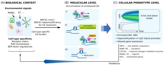 This molecular mechanism of cell type-specific tumorigenesis by BRCA1 deficiency provides an integrated understanding of BRCA1-associated tumors. Until now, deficiency of HR-DSB repair has been the only considerable clinical factor in BRCAness tumors. However, as it is still correlated with HR-DSB repair deficiency, but not limited to this pathway, and addressing an underlying molecular mechanism, this integrated view may extend the possibilities of anticancer therapy or cancer prevention. Furthermore, the mechanism by which multi-level alterations are induced by defective G4 processing provides molecular insights into the nature of tumor clonal evolution. In the case of TNBC, it is known that CNV and aneuploid rearrangements remain stable after an early short burst of crisis, while point mutations evolve gradually, generating an extensive clonal diversity with a much higher mutation rate than ER+ tumor [,].