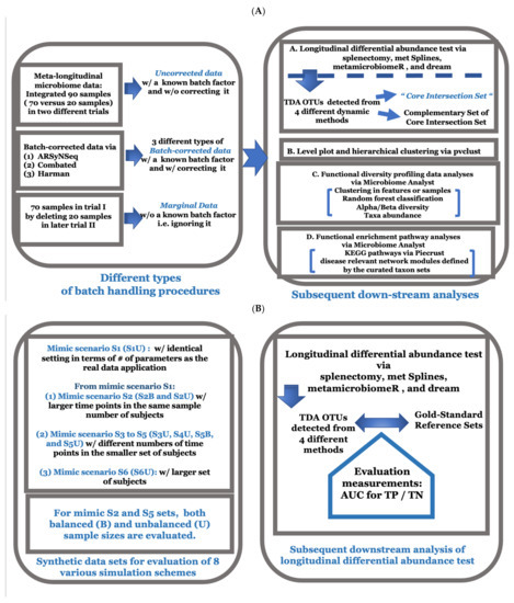 The following supporting information can be downloaded at: https://www.mdpi.com/article/10.3390/genes13030392/s1, Figure S1: The beta diversity profiling 2D-PCoA and classification performances generated from MicrobiomeAnalyst [27,28] for random forest from core intersection sets detected by multiple longitudinal differential abundance test methods in different types of data sets (ARSyNseq-Combated-Marginal Data) in left to right; Table S1: Meta sample profile information; Table S2: FE (Functional Enrichment) and TSEA (Taxonomy-Set Enrichment Analyses); Video S1: Movies for 3D PCA of 5 different batch handling procedures.