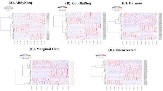 (A–E) show the heatmaps generated by the core-intersection sets from 5 different types of batch handling procedures (ARSyNseq, ComBatSeq, Harman, Uncorrected, and Marginal Data) in clockwise from top-left.