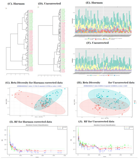 (A) shows the pvclust for Harman-corrected data. AU p-value in red color represents the area calculated by multi-scale bootstrap resampling procedure, whereas BP value in green color represents the bootstrap probability. In general, BP value is less accurate than AU value and AU value is recommended to be selected in the package currently [26]. Note that Harman-corrected data present much tighter grouping clusters in intra-samples except in 3008 at D-14 and 3443 at E-2 subject (highlighted in stars) in control group on pvclust with complete [26], compared to Uncorrected data with more mixed-up patterns between two treatment groups to cluster samples in (B). (B) shows the pvclust for uncorrected data. AU p-value in red color represents the area calculated by multi-scale bootstrap resampling procedure, whereas BP value in green color represents the bootstrap probability. In general, BP value is less accurate than AU value and AU value is recommended to be selected in the package currently [26]. (C–F) show the dendrograms generated from MicrobiomeAnalyst [27,28] for Harman and uncorrected data in left panel and the abundance of taxonomy genus levels in right panel. The type C (red) and P (green) in (C,D) represent control and P drug target treatment group, respectively [27,28]. Note that the sample clustering in plot tree dendrograms is conducted by Ward method in MicrobiomeAnalyst [27,28]. (G–J) shows the β diversity profiling 2D-PCoA and classification performances for random forest generated from MicrobiomeAnalyst [27,28] in Harman (left panel) and uncorrected data (right panel), respectively. Type C and P represent the control and drug target treatment group, respectively. In β diversity profiling analyses, distance method is used by Bray–Curtis Index and statistical significance test is used by permutational MANOVA (PERMANOVA) [27,28].