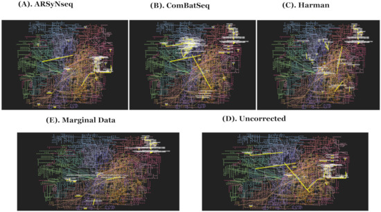 (A–E) show the network enrichment KEGG pathways generated from MicrobiomeAnalyst [27,28] to represent overall functional profiling in association analyses (ARSyNseq, ComBatSeq, Harman, Uncorrected, and Marginal Data) in clockwise from top-left. Note that top 5 significant modules in yellow edges are presented in figures [27,28].